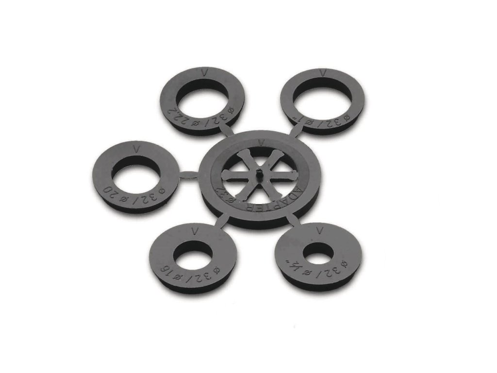 Diese Kunststoffadapter verringern die Klemmbohrung auf die benötigte Größe.