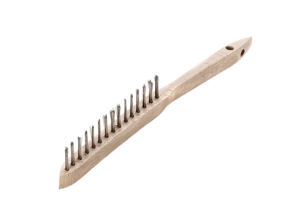 Die Handbürste wird zur manuellen Entfernung von Rost, Schmutz und Farbe auf Edelstahl- oder Aluminiumoberflächen verwendet. Der Bürstenkörper ist aus PEFC zertifiziertem Buchenholz mit doppeltem Aufhängeloch gefertigt. Die hochwertige „Made in Germany“ Qualität wird oft in Handwerksbetrieben, Reparaturwerkstätten, Industriebetrieben und bei Heimwerkern verwendet.
