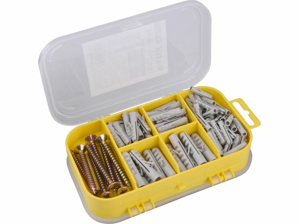 Súprava obsahuje: skrutku 3,5x30 mm - 40 ks skrutku 4,0x40 mm - 25 ks skrutku 5,0x50 mm - 12 ks skrutku 6,0x60 mm - 80 ks hmoždinku 5x25 mm - 40 ks hmoždinku 6x30 mm - 25 ks hmož - 12 ks hmoždinka 10x50 mm - 8 ks plastový organizér