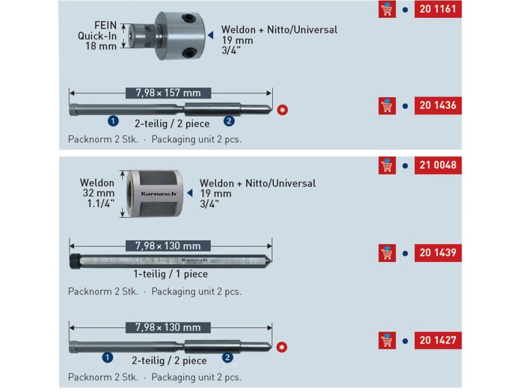 Karnasch Professional Tools ist ein deutsches Unternehmen, das hochwertige Werkzeuge für Industrie und Handwerk herstellt. Sie sind bekannt für ihre technologische Raffinesse, Qualität und Präzision. Ihr Sortiment umfasst Bohrer, Bohrer, Kern und Kern, Fräser, Trennsägeblätter und andere Metallbearbeitungswerkzeuge. Karnasch ist weltweit die erste Wahl für professionelle Anwender. Das in die Produkte einfließende Know-how zeigt sich im täglichen Einsatz. Die Werkzeuge und Maschinen mit ihren hervorragenden Leistungswerten überzeugen Kunden aus allen Branchen rund um den Globus.