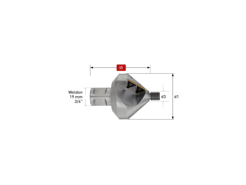 201786045 | Kegelsenker 90 Grad mit Weldonschaft + auswechselbare Hartmetallplatten + Führungsstifte, 2-Schneiden, 4 Einsätze