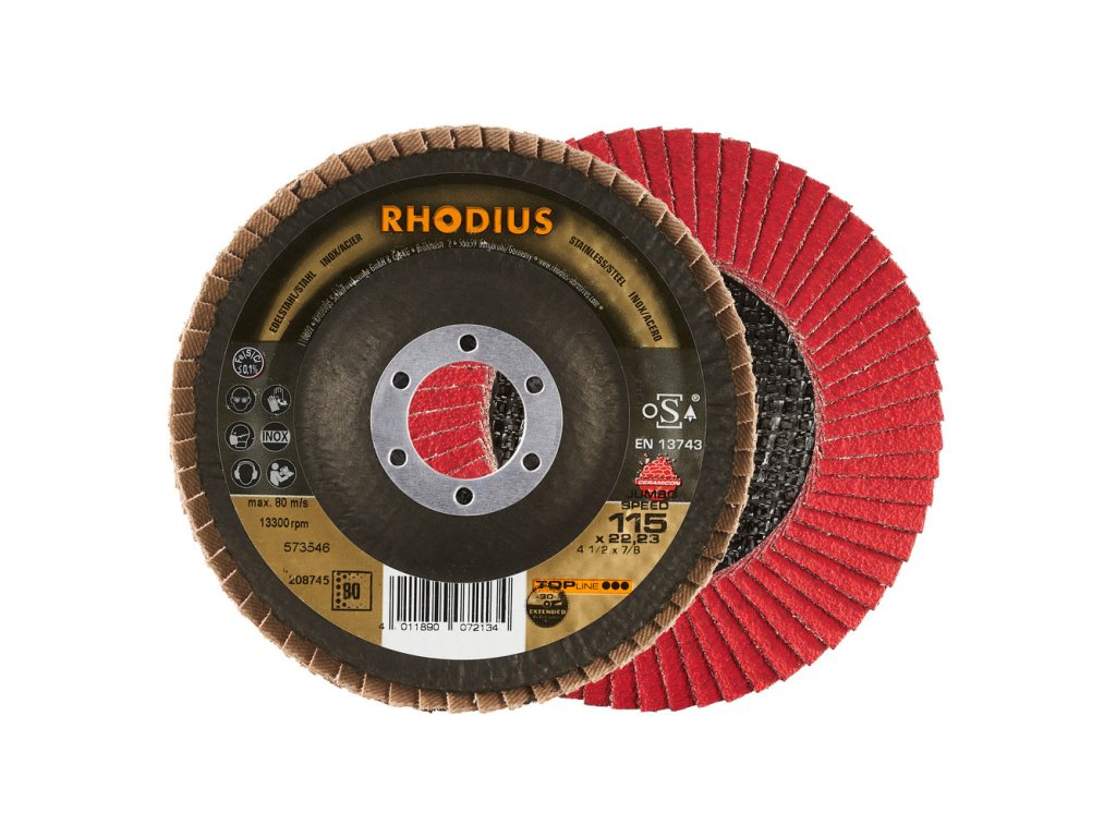 Die RHODIUS Fächerschleifscheibe JUMBO SPEED EXTENDED wurde gezielt für die Bearbeitung von Edelstahl (z.B. V2A, 1.4301), Stahl (Schwarzstahl auch Baustahl, St37, S235JR, 1.0037 oder Karbonstahl genannt) und Stahlguss entwickelt. Die Scheibe punktet hier mit einer sehr hohen Standzeit bei fortwährend aggressivem Abtrag.