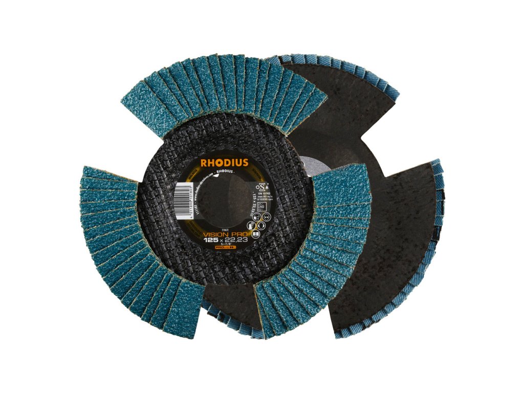 Die Scheibe ist nach EN 13743 hergestellt und sicherheitsgeprüft und zudem oSa-zertifiziert. Sie hat einen Tragteller aus Glasfaser. Der Anwender kann mit hohem Anpressdruck arbeiten. Bei der VISION PRO wird als Schleifkorn ein hochwertiges Zirkonkorund verwendet. Alle RHODIUS-Lamellenscheiben sind zudem eisen- und schwefelfrei. Die Lamellen liegen bei dieser Scheibe konisch auf. Die konische Anordnung der Lamellen von 10° verbessert die Ergonomie während des Schleifens und erleichtert somit die Handhabung.