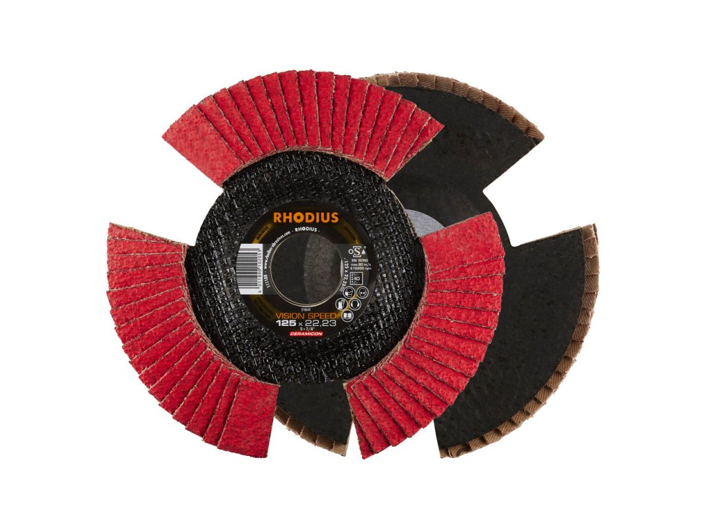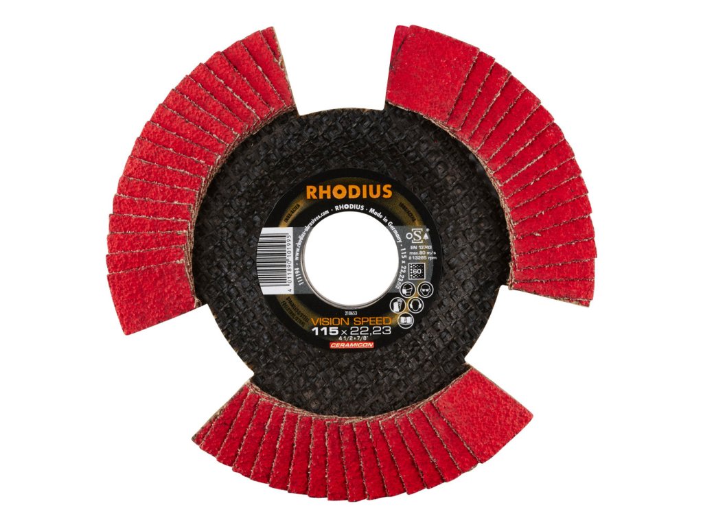 Die Scheibe ist nach EN 13743 hergestellt und sicherheitsgeprüft und zudem oSa-zertifiziert. Sie hat einen Tragteller aus Glasfaser. Der Anwender kann mit hohem Anpressdruck arbeiten. Bei der VISION SPEED wird als Schleifkorn ein hochwertiges Keramikkorn (Sinterkorund) verwendet. Dieses ist selbstschärfend. Alle RHODIUS-Lamellenscheiben sind zudem eisen- und schwefelfrei. Die Lamellen liegen bei dieser Scheibe konisch auf. Die konische Anordnung der Lamellen von 12° verbessert die Ergonomie während des Schleifens und erleichtert somit die Handhabung.