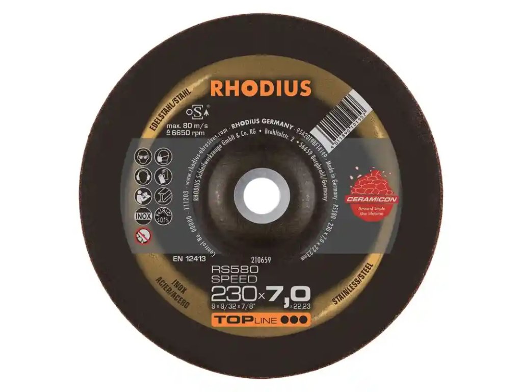 Die RHODIUS RS580 EXTENDED wurde gezielt für die Bearbeitung von Edelstahl (VA-Stahl, Inox), z.B. 1.4301 (X5CrNi18-10 oder 304), Stahl (Schwarzstahl auch Baustahl, St37, S235JR, 1.0037 oder Karbonstahl genannt) und Stahlguss entwickelt. Die Schruppscheibe RS580 EXTENDED eignet sich hervorragend für das Anfasen, für die Schweißnahtvorbereitung, für das Egalisieren von Schweißnähten und um Gussteile zu verputzen bzw. zu egalisieren.