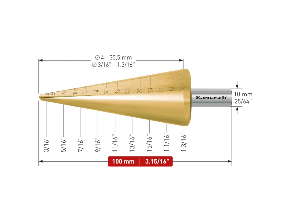 Der Karnasch Professional Blechschälbohrer aus HSS-XE Stahl + TiN-GOLD Beschichtung, Gerade genutet mit Kreuzanschliff