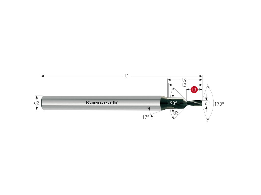 Tvrdokovový, mikro-pilotný, stupňovitý vrták 170 ° / 190 ° určený pre Mikro-vrták pre hlboké diery 220322, HSC / HPC, povlakovaný.