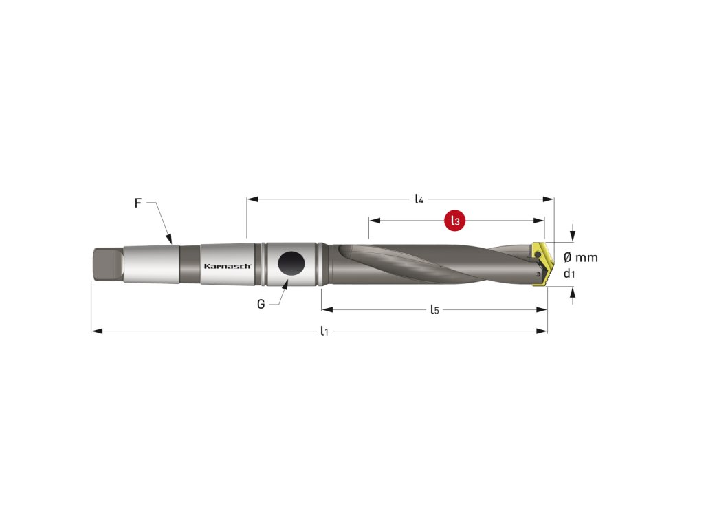 Stopka Morse kužel podle ISO 296 typ BEK. Spirálové drážky. Vrták rotuje, dílec stojí. Např. sloupové vrtačky, radiální vrtačky. Spirálové držáky se nejvíce používají. Držák je dodáván bez vyměnitelných břitů ale s 2x TORX upínacími šrouby a 1x TORX klíč.Zusätzliche Parameter
