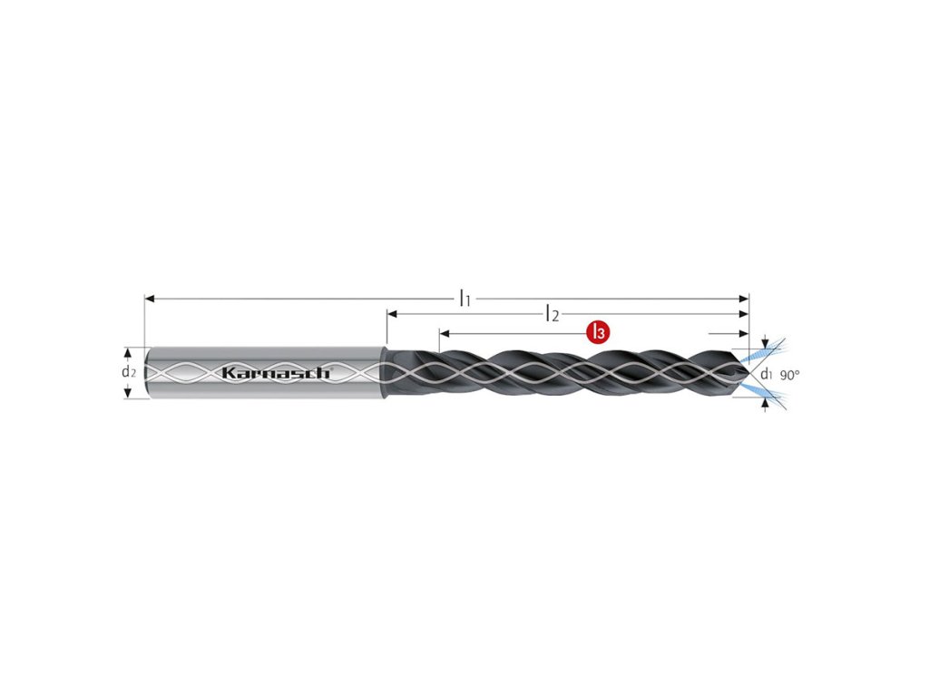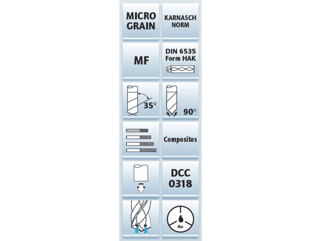Tvrdokovový, vysokovýkonný vrták pre GFK/CFK, povlakovaný diamantom - jednosmerový - s 90° špičkou, znižuje delamináciu, pre kompozity, s vnútorným chladením.