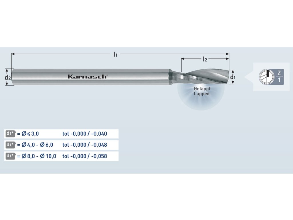 Tvrdokovová jednozubá fréza na hotovo, pravotočivá špirála.