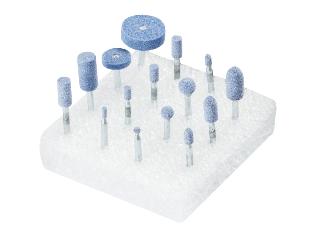 Das Set enthält 15 kleine Schleifstifte mit Schaftdurchmesser 3 mm in den gebräuchlichsten Formen für Feinarbeiten.