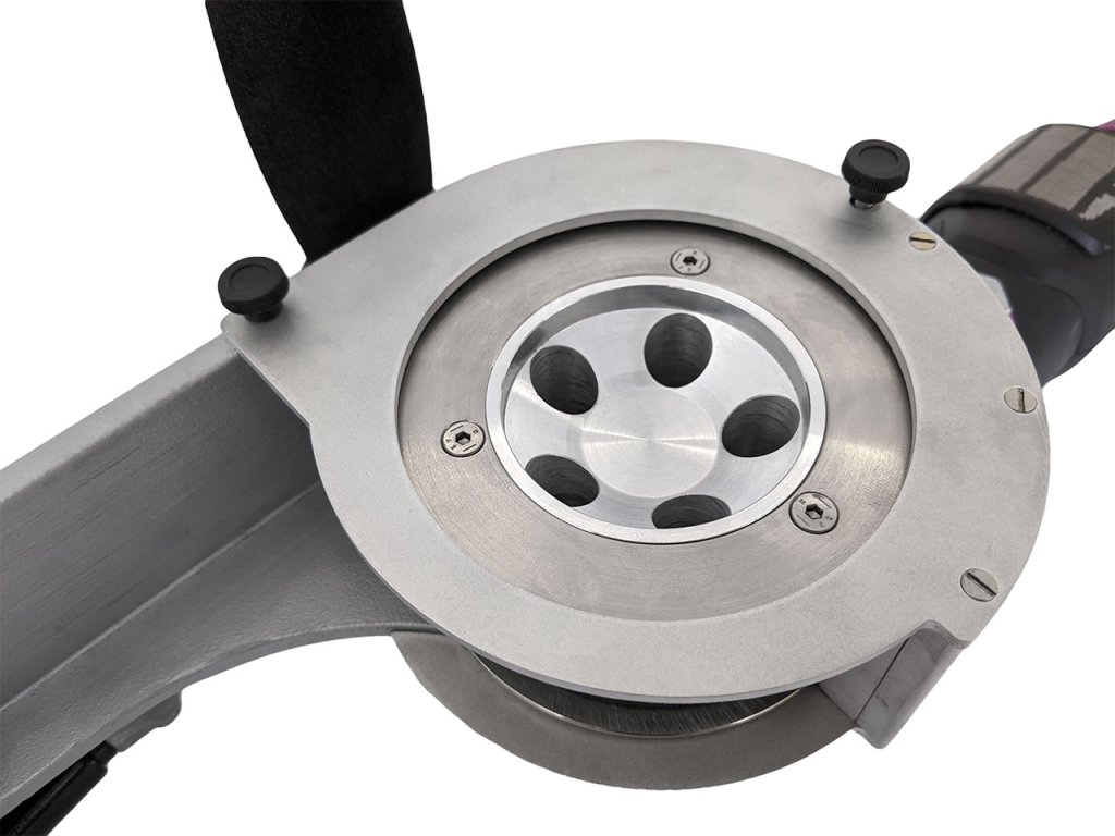 Er verhindert effektiv, dass Finger im Antriebsmechanismus eingeklemmt werden. Die Montage erfolgt einfach und werkzeuglos mittels Rändelschrauben. Der Fingerschutz ermöglicht zudem das Aufstellen der Maschine auf der Werkbank ohne Kontakt zum Riemen.