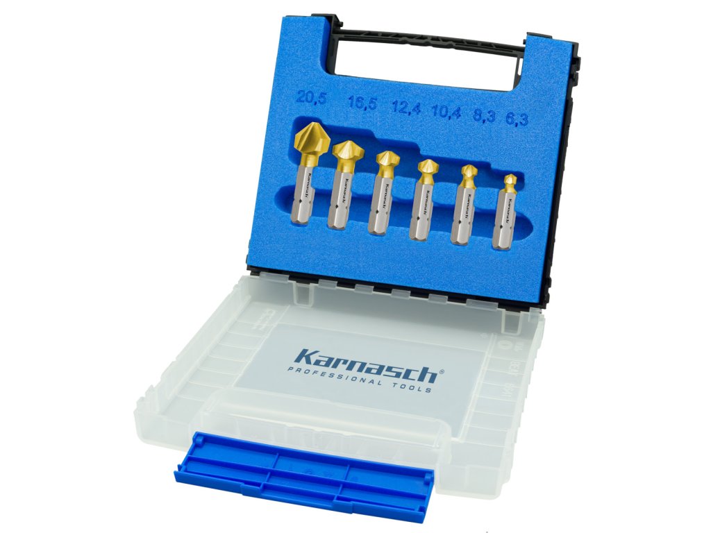 403095010 | Set HSS-XE + TiN beschichteter Kegelsenker, Ungleichteilung, DIN 335 Form C 90° mit Bitaufnahme „kurz“ 6,3-8,3-10,4-12,4-16,5-20,5 mm