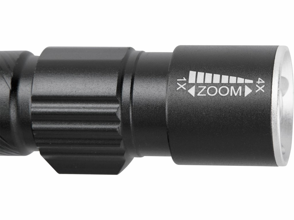 - ZOOM-Funktion: Durch Verschieben der Linse an der Vorderseite der Taschenlampe lassen sich Breite und Intensität des Lichtkegels verändern.