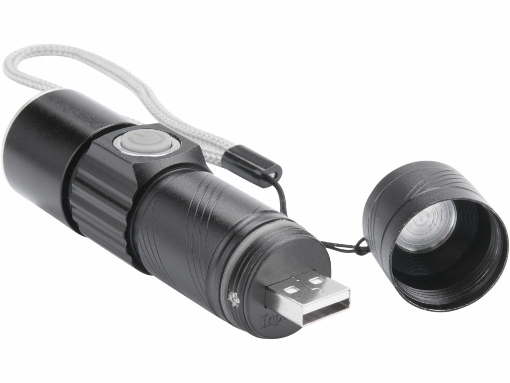 - 3-W-Cree-LED mit hoher Helligkeit (150 Lumen), max. Reichweite 200 m, Stromversorgung: 3,7 V/450 mAh Li-Ion-Akku, Aufladung über USB-A, 3 Leuchtmodi: 100 % – 50 % – 100 % Blinklicht, ZOOM-Funktion zur Anpassung von Breite und Intensität des Lichtkegels, Gewicht ohne Batterien: 64 g