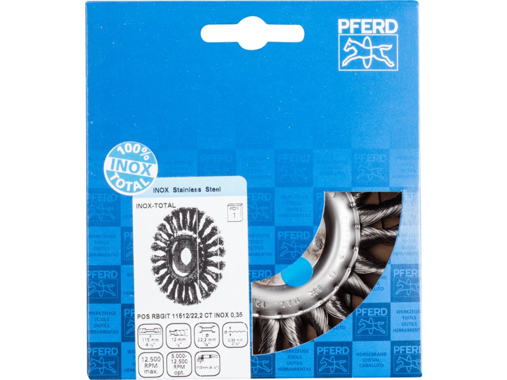 Für die Bearbeitung von Edelstahl (INOX) bietet PFERD TOOLS zusätzlich zu Bürsten mit Edelstahlbesatz auch Bürsten in der Ausführung INOX-TOTAL an. Sie sind insbesondere für den Einsatz in extrem kritischem Umfeld geeignet.