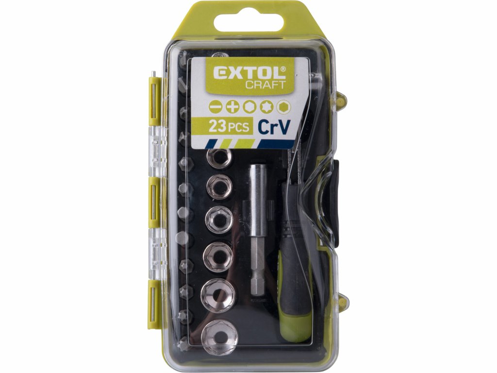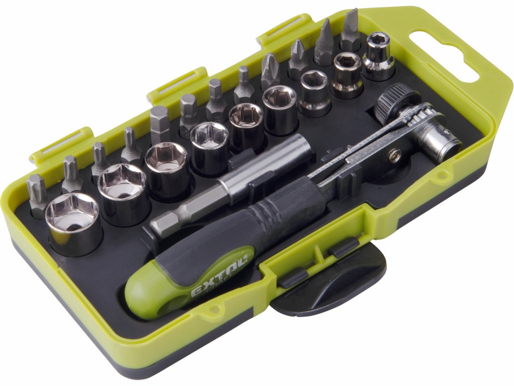 - 1/4", 23-teiliges Set, Steckschlüssel: 4-5-6-7-8-9-10-12-13 mm, 1/4"-Verlängerung 75 mm, Bits 1/4" x 25 mm: (-)5-6 mm, (+)PH1-2, (HEX)3-4-5-6 mm, (TORX)T15-20-25-30, Ratsche mit 1/4"-Außenvierkant für Steckschlüssel und 1/4"-Innensechskant für Bits, Kunststoffkoffer <