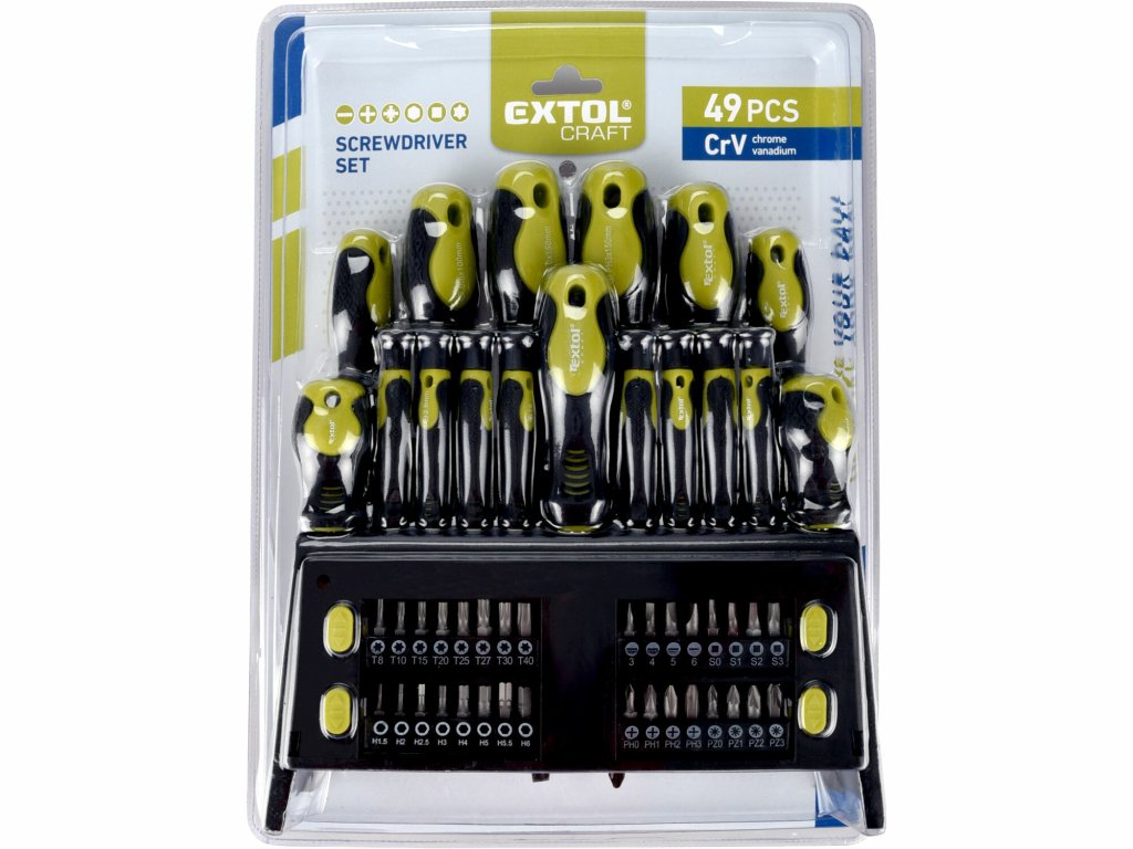 Schraubendreher mit Griffen; aus hartem, gummiertem Kunststoff mit hochwertigem Chrom-Vanadium-Stahlschaft. Das Set beinhaltet: (-)4x75, 6,5x38, 6,5x100, 8x150. Kreuzgewinde (+)PH1x75, PH2x38, PH2x100, PH3x150, Schrauben (-)1,5-2,5-3x50, (+)PH00-0x50, (TORX)T5-6-7-x50, magnetischer Schraubendreher für Bits 1/4"x75, Bits 1/4" 25 mm (-)3-4-5-6, (+)PH0-1-2-3, PZ0-1-2-3, HEX 1,5-2-2,5-3-4-5-5,5-6, Bits 1/4" TORX T8-10-20-25-27-30-40, quadratischer SQ0-1-2-3, Kunststoffständer mit Wandbefestigungsmöglichkeit.Zusätzliche Parameter