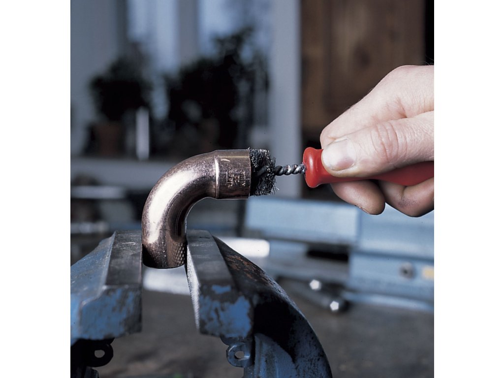 Die Fittingbürste wird zum Reinigen und Entstauben von Edelstahl- oder Kupferfittings, Rohren, Gitterrosten, Muffen und Zylindern und zum Entgraten von Querbohrungen verwendet.