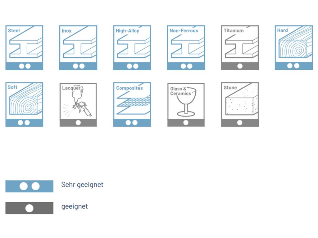Bearbeitetes Material: Edelstahl, Glas, Keramik, Hartholz, hochlegierte Legierungen, lackierte Oberfläche, Nichteisenmetalle/Eisenmetalle, Stahl, Stein, Titan und Legierungen, Verbundwerkstoffe, Weichholz