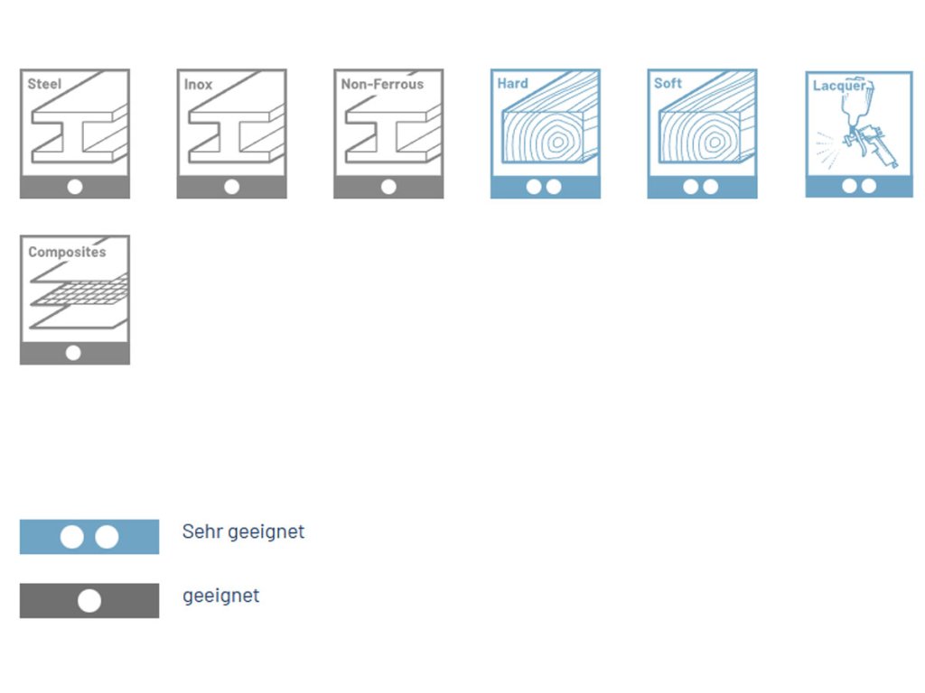 | Bearbeitetes Material: | Holz, Karosseriedichtmittel, lackierte Oberfläche, Nichteisenmetalle, Stahl, Verbundwerkstoffe CFK/GFK |