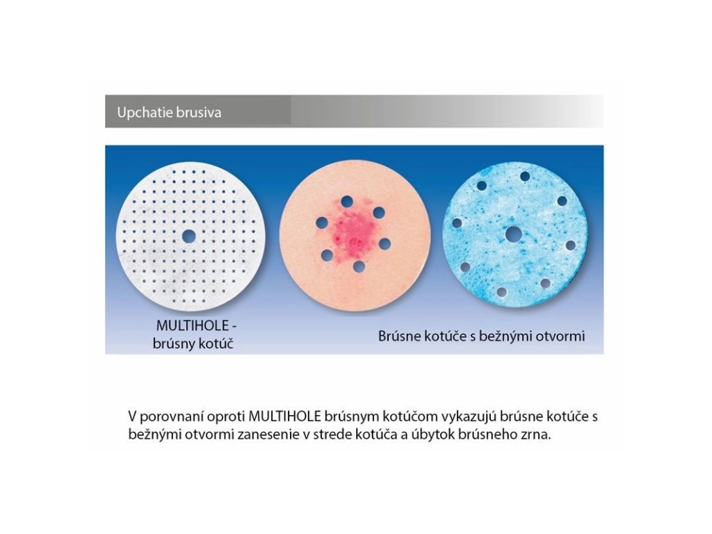 Ďalšie výhody pri použití brúsnych kotúčov so systémom odsávania prachu MULTIHOLE: Dlhšia životnosť v porovnaní s brúsnymi kotúčmi s konvenčným odsávaním prachu a výrazne lepší výsledok vďaka celoplošnému odsávaniu prachu