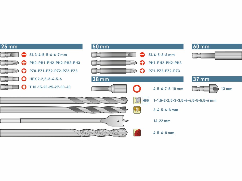 Ein Set der gängigsten Bohrer für Holz, Stahl und Mauerwerk aus hochwertigem HSS-Stahl, Bohrer aus CrV-Stahl in Längen von 25 und 50 mm sowie eine Schablone zur Bestimmung des Durchmessers von 1–10 mm. Das Set beinhaltet: Metallbohrer (Durchmesser 1–1,5–2–2,5–3–3,5–4–4,5–5,5–6 mm), Mauerwerksbohrer (Durchmesser 4–5–6–8 mm), Holzbohrer (Durchmesser 3–4–5–6–8 mm). 16–22 mmZusätzliche Parameter