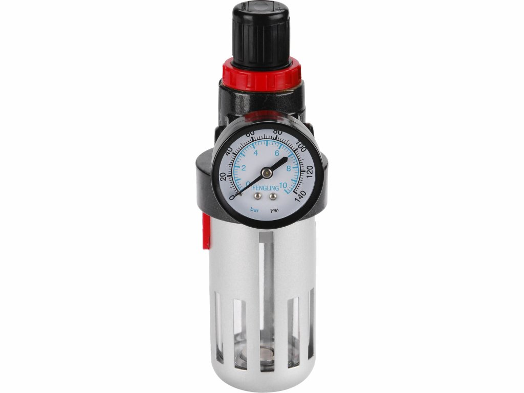 Regulátor tlaku s filtrom a manometrom je určený na reguláciu tlaku stlačeného vzduchu, ďalej na odstránenie skondenzovanej vlhkosti a stopového množstva oleja zo vzduchu vychádzajúceho z kompresora. Zariadenie nachádza uplatnenie pri používaní pneumatického náradia s požiadavkou na suchý vzduch zbavený olejovej hmly, napr. pre pneumatické striekacie pištole určené na nanášania náterových hmôt.