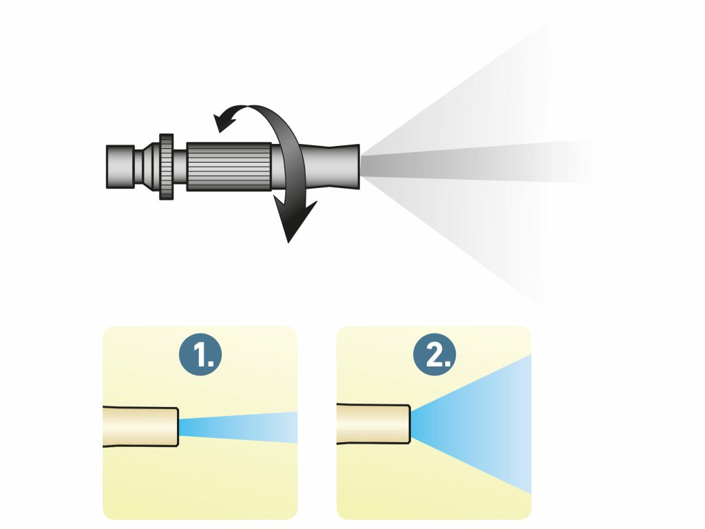 Sprühstärkeneinstellung von feinem Nebel bis zum vollen Strahl.