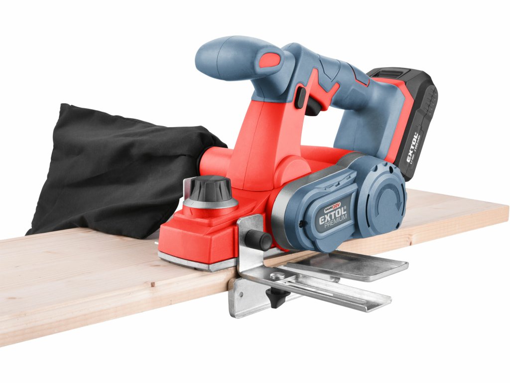 Der EXTOLPremium Akku-Hobel vereint die Geschwindigkeit und Leistung eines Elektrohobels mit dem Komfort eines Akku-Werkzeugs. Das Ergebnis ist ein schneller und präziser Materialabtrag ohne lästiges Kabel. Der Hobelzylinder ist mit zwei hochwertigen Messern ausgestattet. Ein Schutzstift an der Unterseite des Hobelsockels schützt sowohl die Messer als auch das Werkstück, indem er den Hobelsockel und die Messer zwischen den Arbeitsgängen anhebt und so den Kontakt mit der Werkstückoberfläche verhindert. Ein am Staubauslass angeschlossener Auffangsack sorgt für einen sauberen und staubfreien Arbeitsbereich. Mit dem mitgelieferten Falzadapter lassen sich Halbnuten einfach herstellen, und der verstellbare Anschlag hält den Hobel im gewünschten Abstand. Für normale Arbeiten genügen ein oder zwei 2000-mAh-Akkus, die Sie mit einem Schnellladegerät schnell aufladen können. Für anspruchsvollere oder längere Arbeiten empfehlen wir größere Akkus mit einer Kapazität von 4000 mAh. Die Akkus sind mit allen Werkzeugen der EXTOL Share20V-Serie kompatibel und dank Lithium-Ionen-Technologie jederzeit wiederaufladbar, ohne dass Kapazität oder Lebensdauer beeinträchtigt werden. Lithium-Ionen-Akkus verlieren aufgrund der Selbstentladung nur sehr langsam Energie und bleiben lange geladen und einsatzbereit.