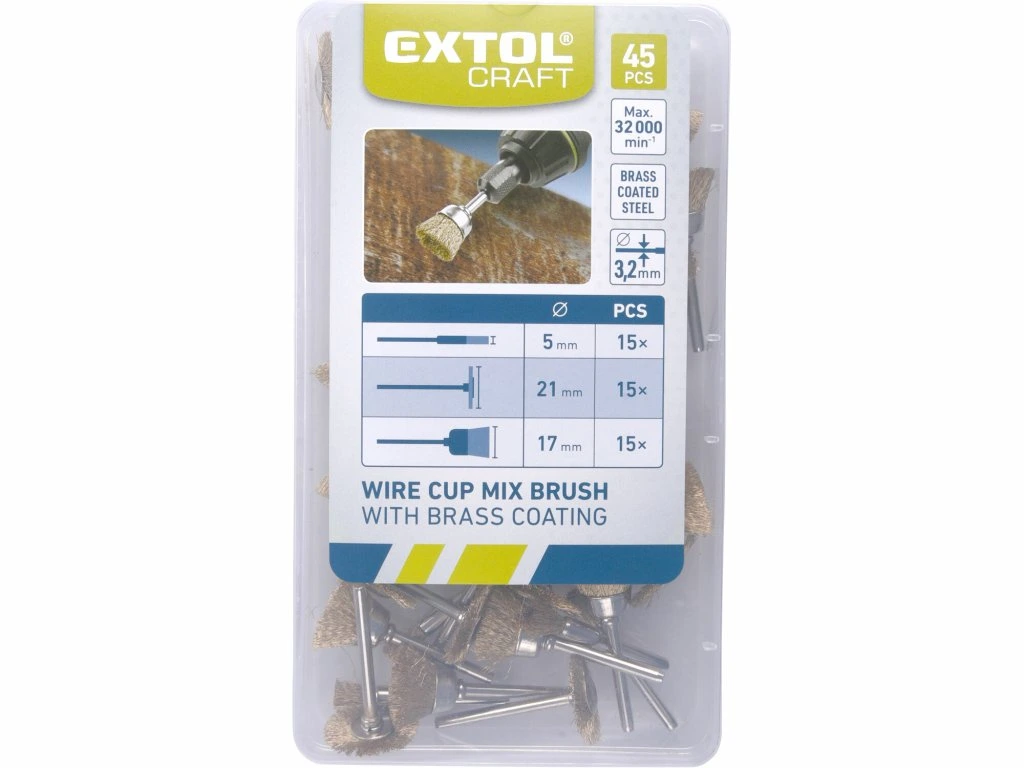 - Set 45 Stück, axiale Teile 15 Stück Ø5mm, Teller 15 Stück Ø17 mm, radiale 15 Stück Ø 21mm, Schaft Ø 3,2mm, Stahldraht vermessingt gewellt, max. Geschwindigkeit 32000/min, Kunstoffbox