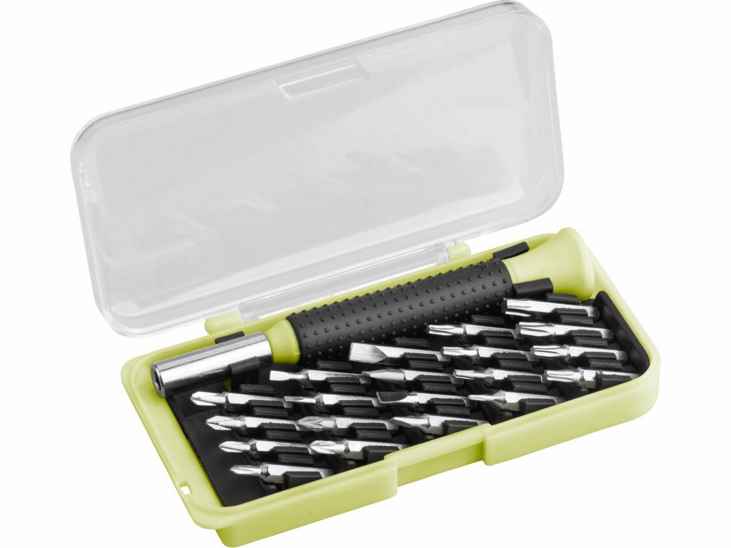 - 21-teiliges Set, Bits 4 mm: (-)1,5-2-2,5-3-3,5-4 mm, (+)PH000-00-0-1, PZ0-1, (TORX)T5-6-7-8-9-10-15-20