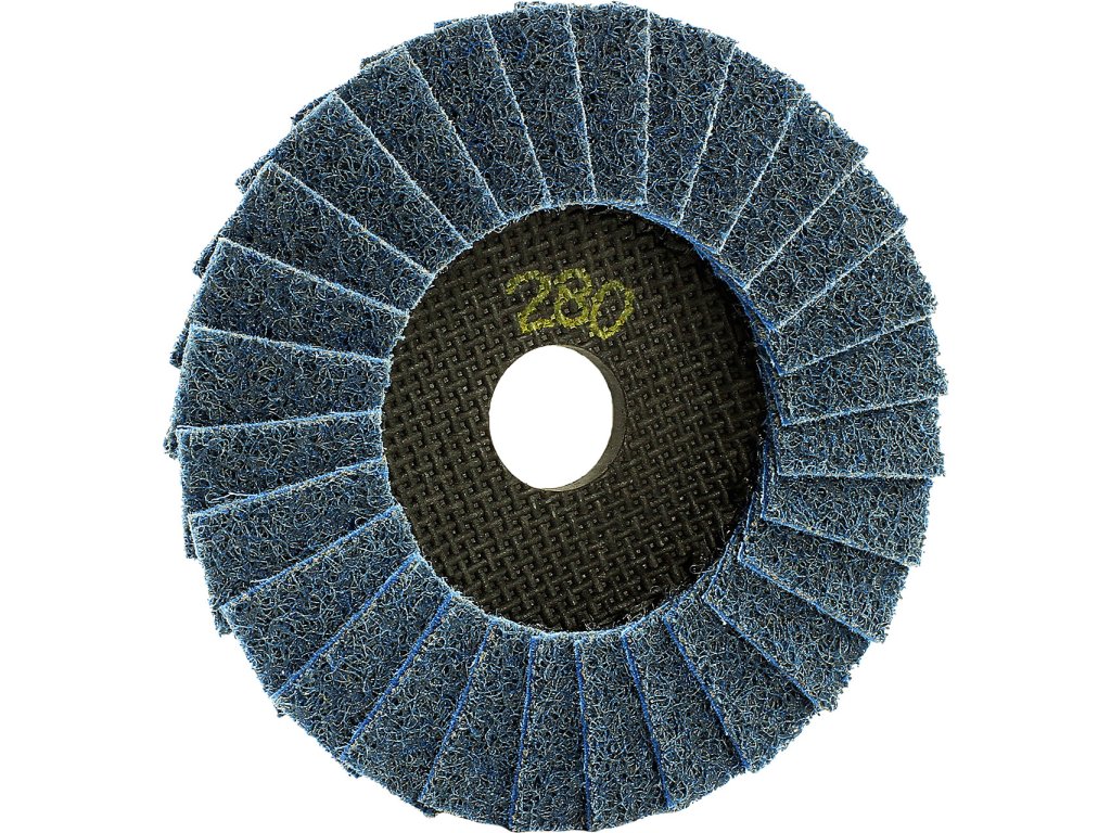 Elastische SC-Vlies Fächerscheibe für das Feinschleifen von geraden und geformten Bauteilen. Durch die Federwirkung der Lamellenpakete werden weiche Schleifübergänge erzeugt, die eine Nacharbeit oft nicht mehr nötig machen. Damit kann der Anwender durch den ausgeübten Anpressdruck selbst entscheiden, ob Material abgetragen werden soll, oder bei leichtem Druck, die Oberfläche nur geschönt oder fein entgratet wird.