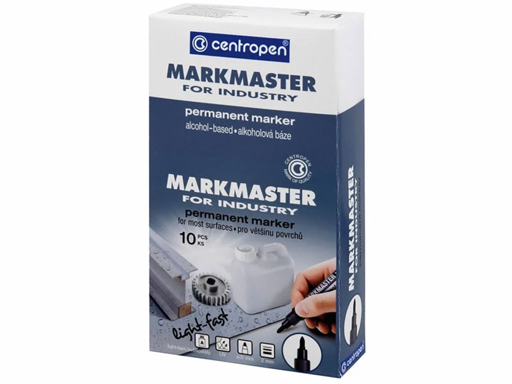 Universeller schwarzer Permanentmarker mit runder Spitze und hochpigmentierter Tinte auf Alkoholbasis, geeignet für die meisten Oberflächen. Wasser-, witterungs- und abriebfest.