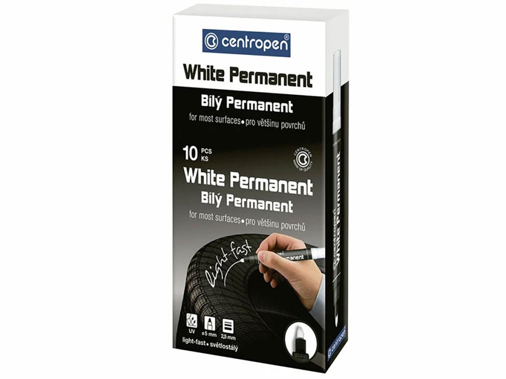 Universeller, weißer, lichtbeständiger Permanentmarker mit runder Spitze und Tinte auf Wasserbasis, geeignet für die meisten Oberflächen. Nach dem Trocknen ist er wasserfest, witterungsbeständig und abriebfest.